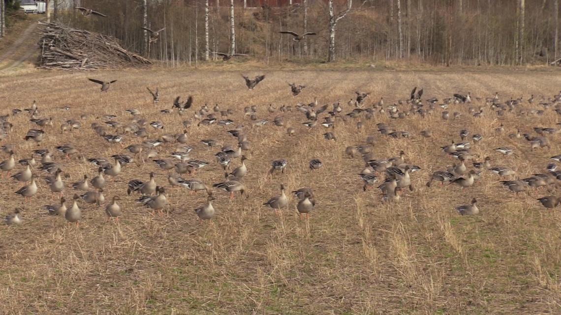 PUBLICERAT: 24.04.2026Hundratals gäss samlas på åkrarna i Närpes nu. Det är frågan om grågås mest och vitkindad.