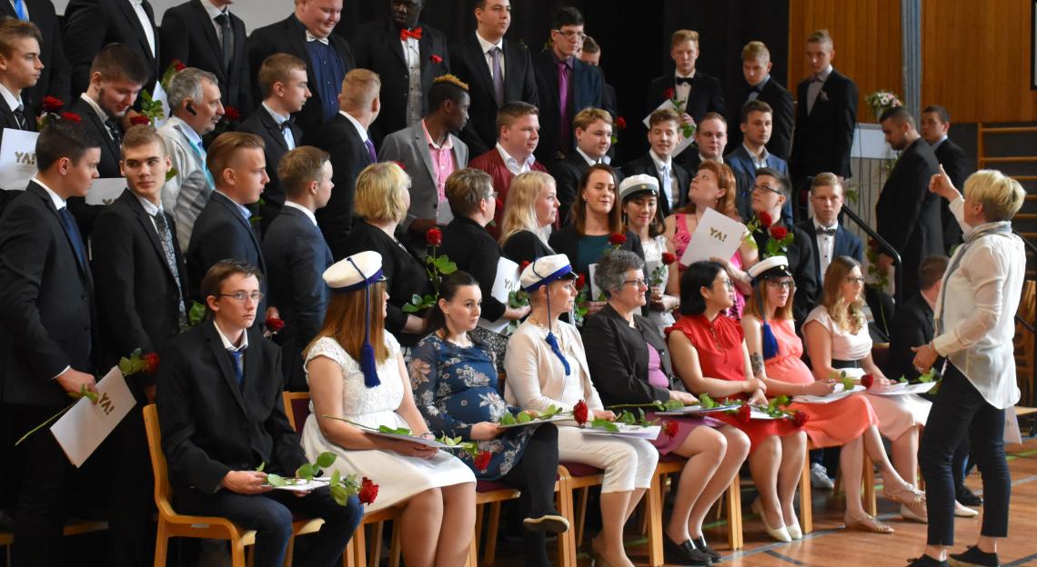 PUBLICERAT: 01.06.2019På lördagen utdimitterades 50 studenter från Närpes gymnasium. Dimissionen hölls i simhallens festsal och efteråt traditionsenlig fotografering i gymnasiet.