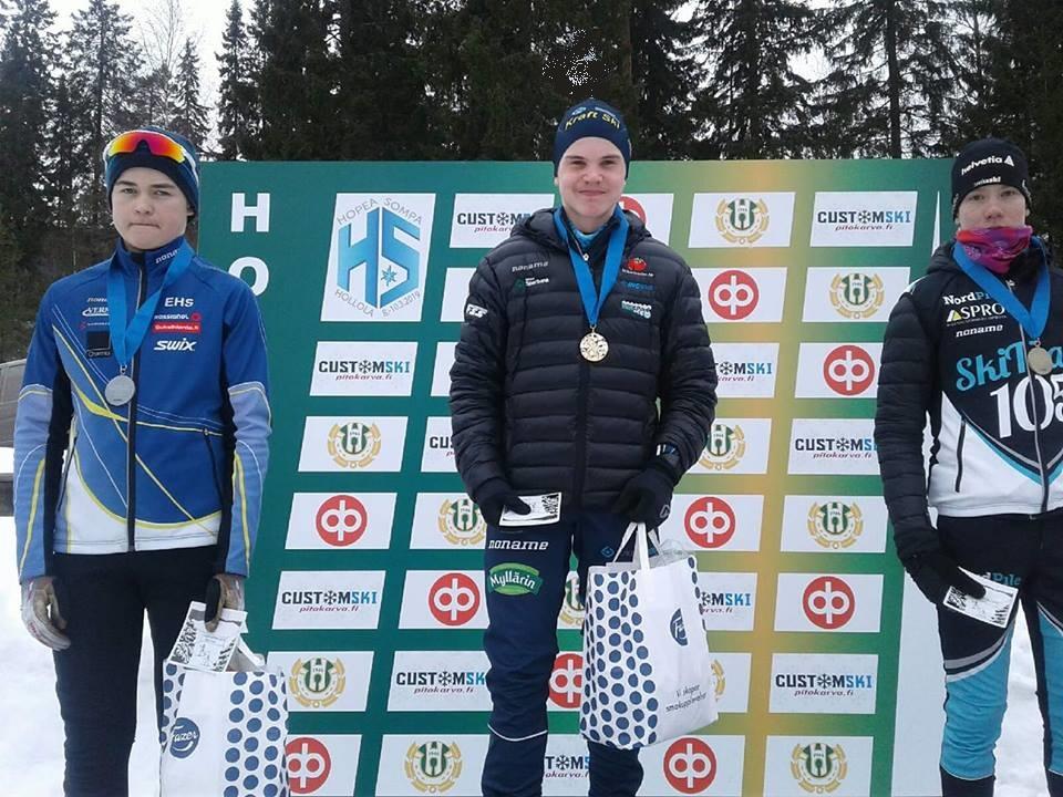PUBLICERAT: 08.03.2019I fredagens sprint i Hopeasompa tog Lukas Kuuttinen guld. Här bild från prisutdelningen. Till vänster tvåan Anton Pakkalén och till höger trean Daniel Onnela.