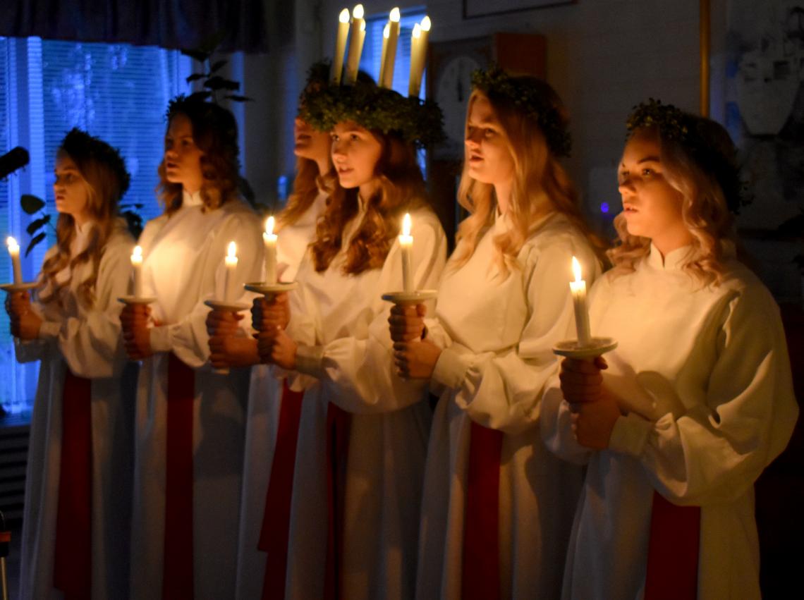 PUBLICERAT: 11.12.2018På tisdagen inledde Närpesbygdens lucia Miranda Westerback tillsammans med sina tärnor luciauppdragen. Inledningsvis en hel del hembesök, men även som här på bilden Mariahemmet i Kaskö.