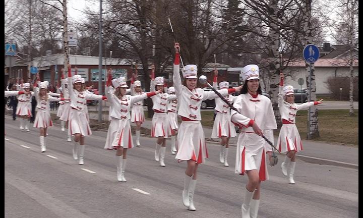 PUBLICERAT: 01.05.2018Skolmusikkåren med drillflickorna i spetsen startar här paraden genom Närpes centrum på väg mot simhallen.