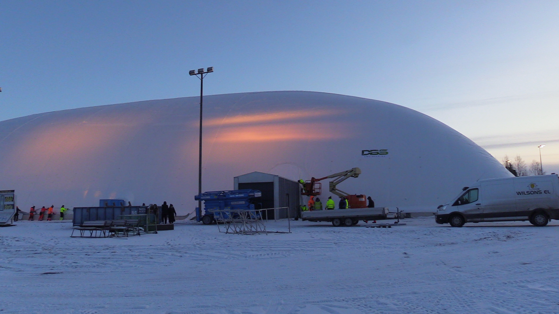 På lördagsmorgonen reste sig den nya idrottshallen i Mosedal. Monteringsjobbet var klart, fläktarna sattes igång och det dröjde inte länge innan hallen reste sig och började ta form. Vid halv tiotiden var den uppe. Trots att det var 17 grader kallt gick lyftet bra och hallen fick till synes rätt form, trots kylan. Nu återstår en hel del monteringsjobb på insidan innnan allt är klart, det beräknas ta en vecka till.