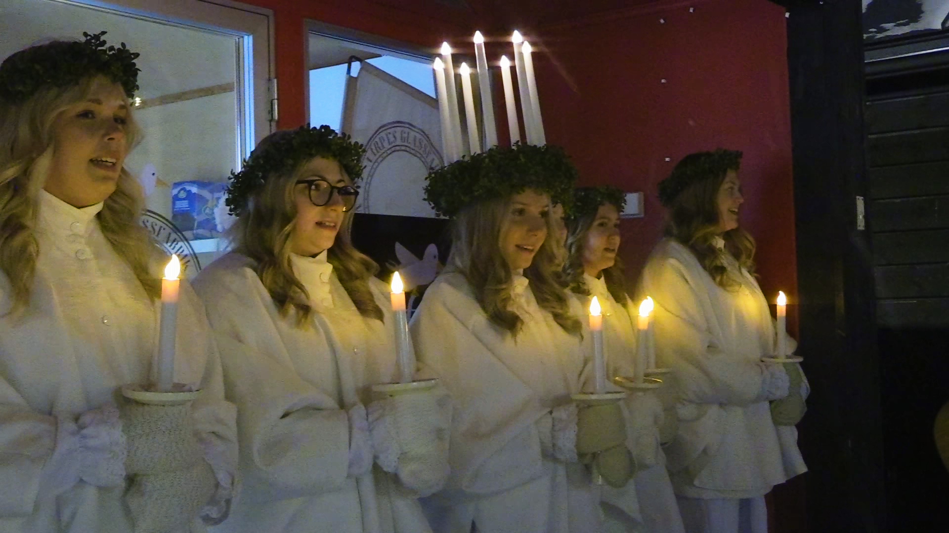 Trots kalla vindar och snöyra sjöng lucia och tärnor på torget på luciadagskvällen. De deltog också i ringlekarna efteråt innan de åkte vidare till högtidligheterna i kyrkan. lördag, december 13, 2025