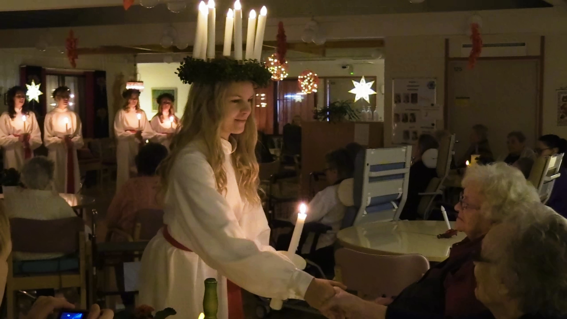 Närpeslucia med tärnor inledde besöken i hem och institutioner på söndagsmorgonen med att besöka enskilda i Pörtom och sedan Pörtehemmet (bilden). Till söndagens program hör många hembesök i Övermark och Pörtom, på måndag främst hembesök i västra byarna men man uppträder också t.ex. på fullmäktigemötet och på tisdagen, luciadagen, är det institutionerna i centrumområdet som får besök. Kl. 18 på tisdag startar luciatåget genom centrum.