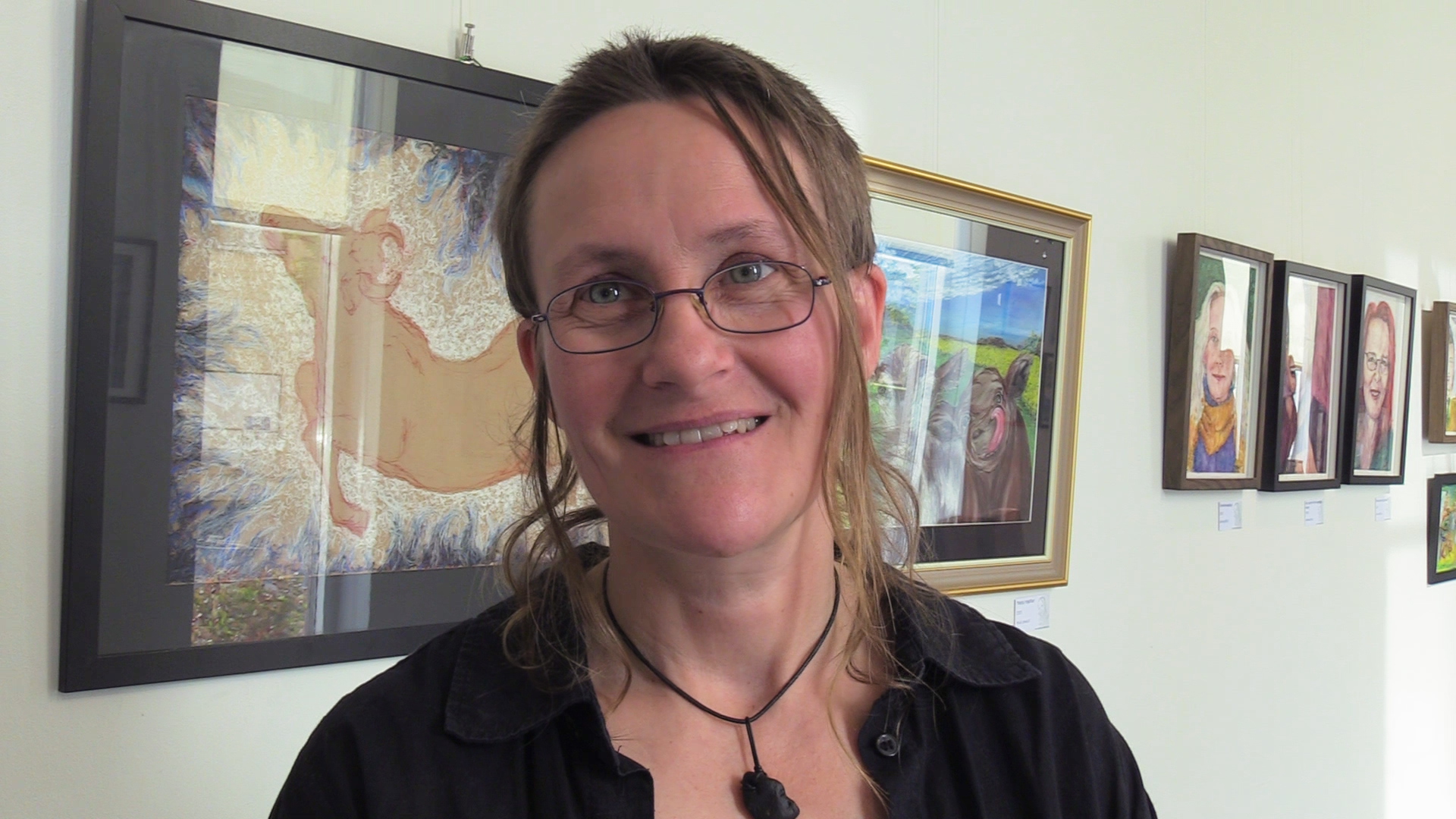 Miia Berg, född i Valsberg men numera bosatt i Åbotrakten, har av konstklubben utsetts till årets konstnär. På lördagen hade hon vernissage i konsthallen med många tavlor upphängda och många besökare på plats.