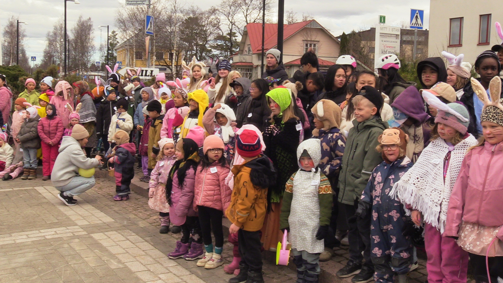 Påskfest med många utklädda häxor var det på lördagen på torget i Närpes. Det var den 50:e påskfesten som Lions ordnade, det var i mitten på 1970-talet som man började och då hölls festen i Öjskogsparken, på Vargberget några år och på senare år på torget. På bilden har årets häxor ställt upp för att få varsitt påskägg.
